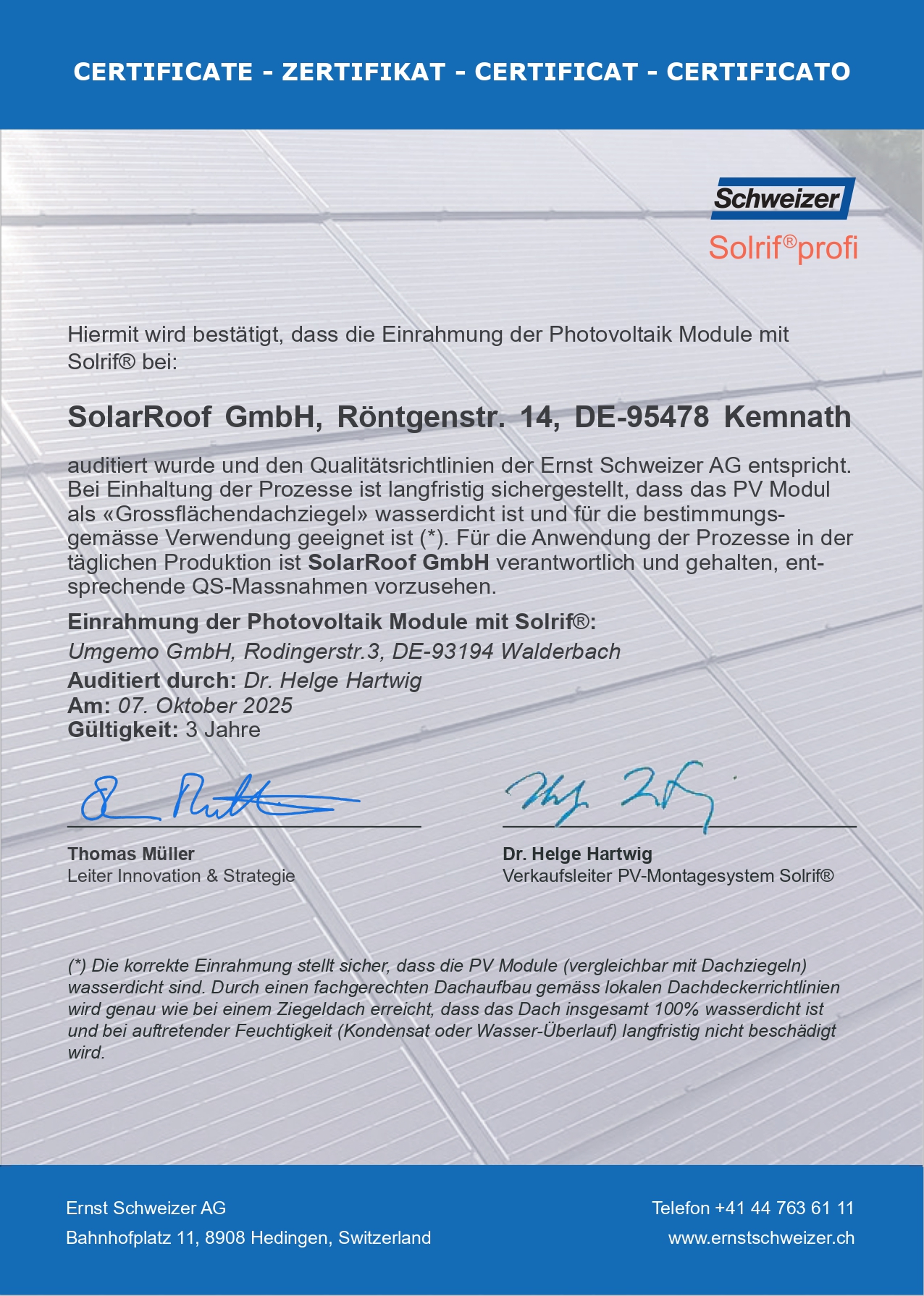 Die SolarRoof GmbH ist Hersteller von Indach-Solarmodulen mit Solrif® und fokussiert auf architektonisch integrierte Photovoltaik in Deutschland, Österreich und der Schweiz. Mit Indach-Modulen der aktuell höchsten Leistungsklasse in ihrer Art, kombiniert mit Projektbegleitung und Montageunterstützung, realisiert SolarRoof effiziente und ästhetische PV-Lösungen für Neubau, Renovierung und denkmalgeschützte Objekte.
